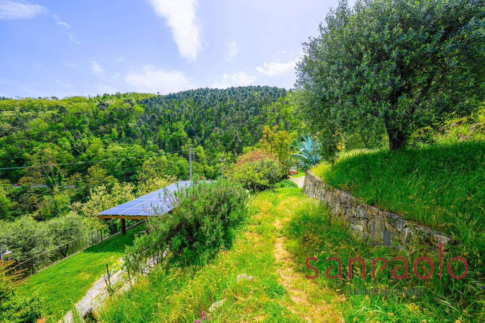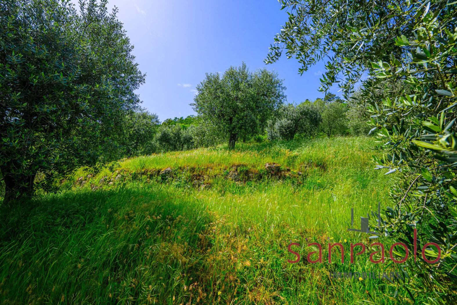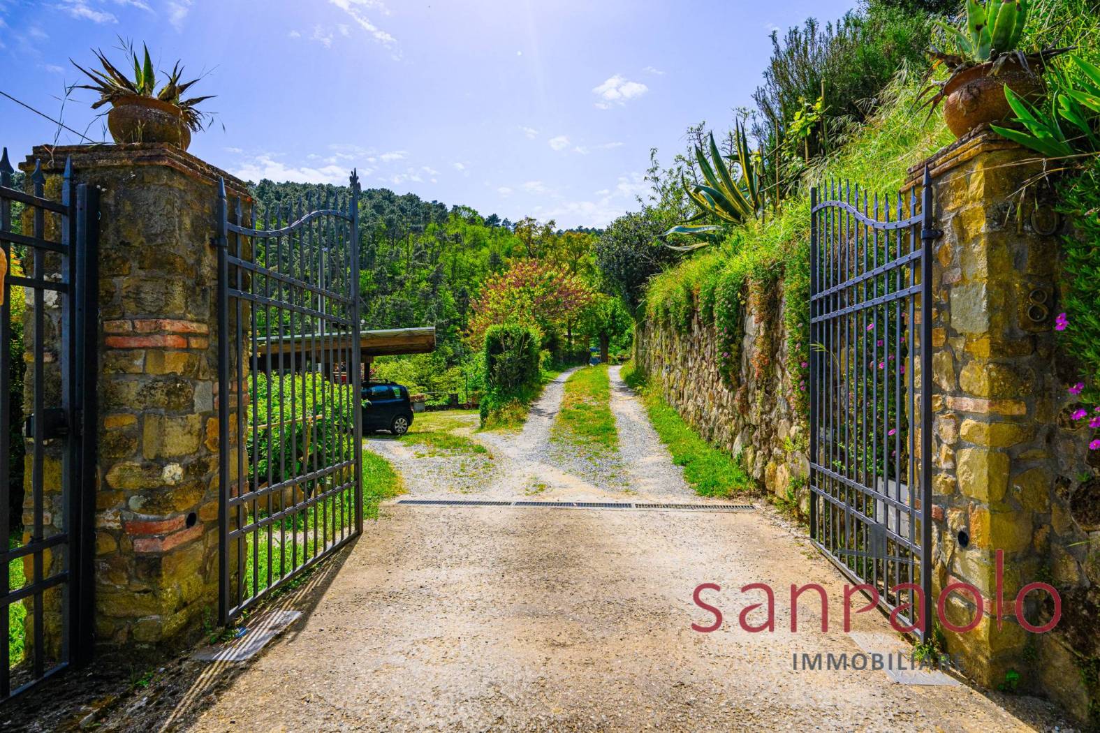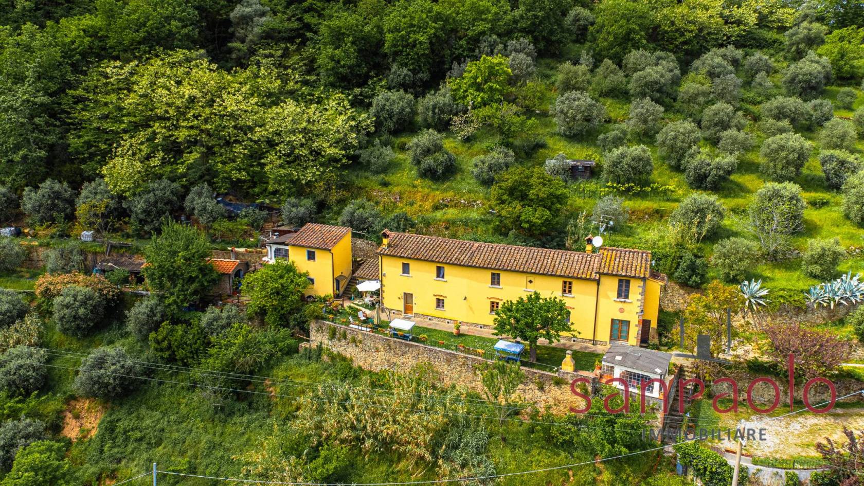 All'esterno, la proprietà si estende su circa 2,8 ettari di terreno, in parte a uliveto, frutteto e bosco. Gli ampi spazi verdi offrono un contesto ideale per vivere all'aria aperta in completa autonomia. L'approvvigionamento idrico è garantito da una sorgente privata.