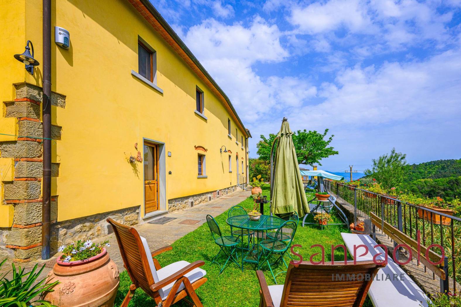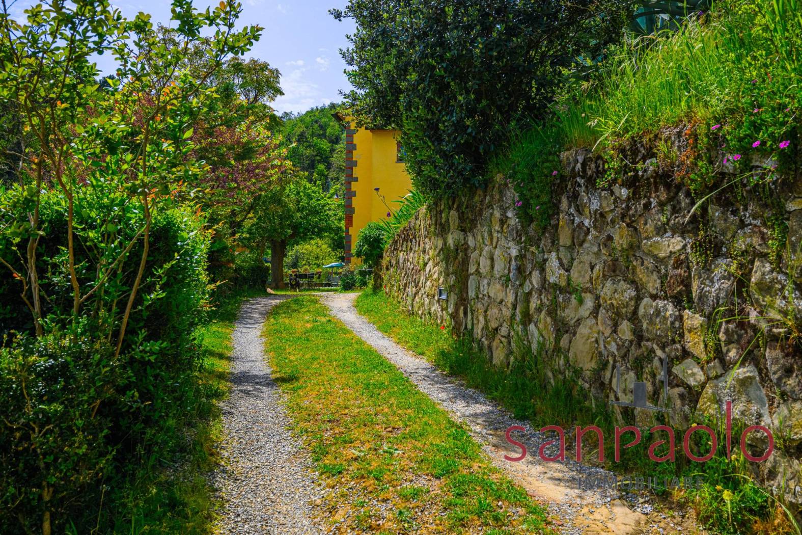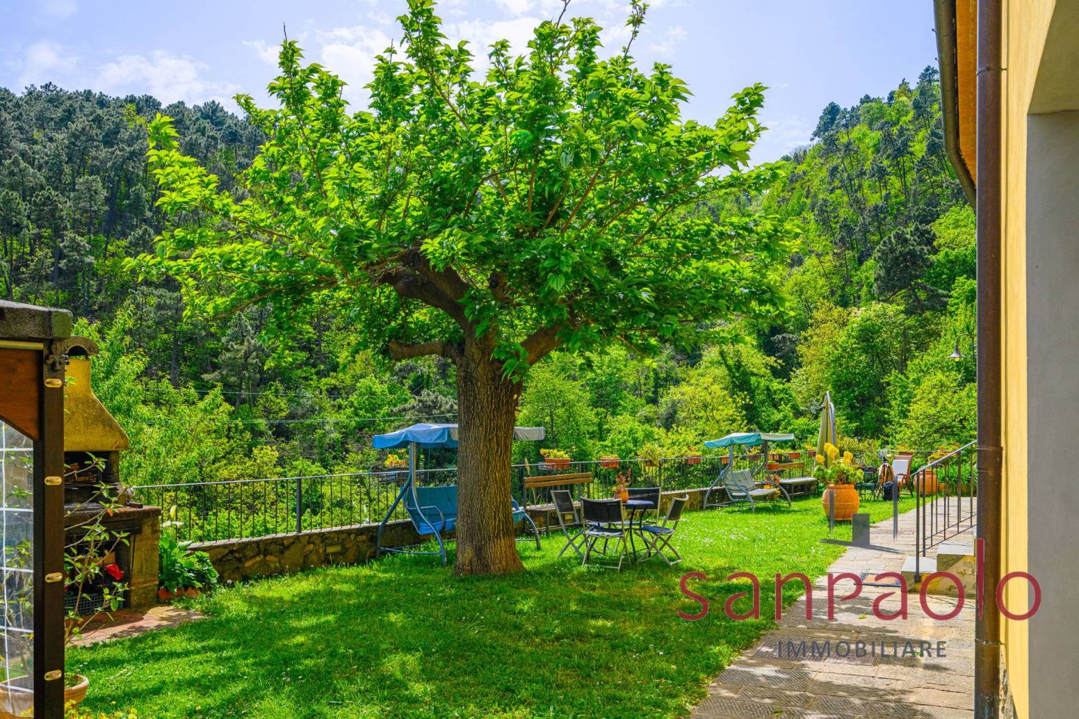 All'esterno, la proprietà si estende su circa 2,8 ettari di terreno, in parte a uliveto, frutteto e bosco. Gli ampi spazi verdi offrono un contesto ideale per vivere all'aria aperta in completa autonomia. L'approvvigionamento idrico è garantito da una sorgente privata.
