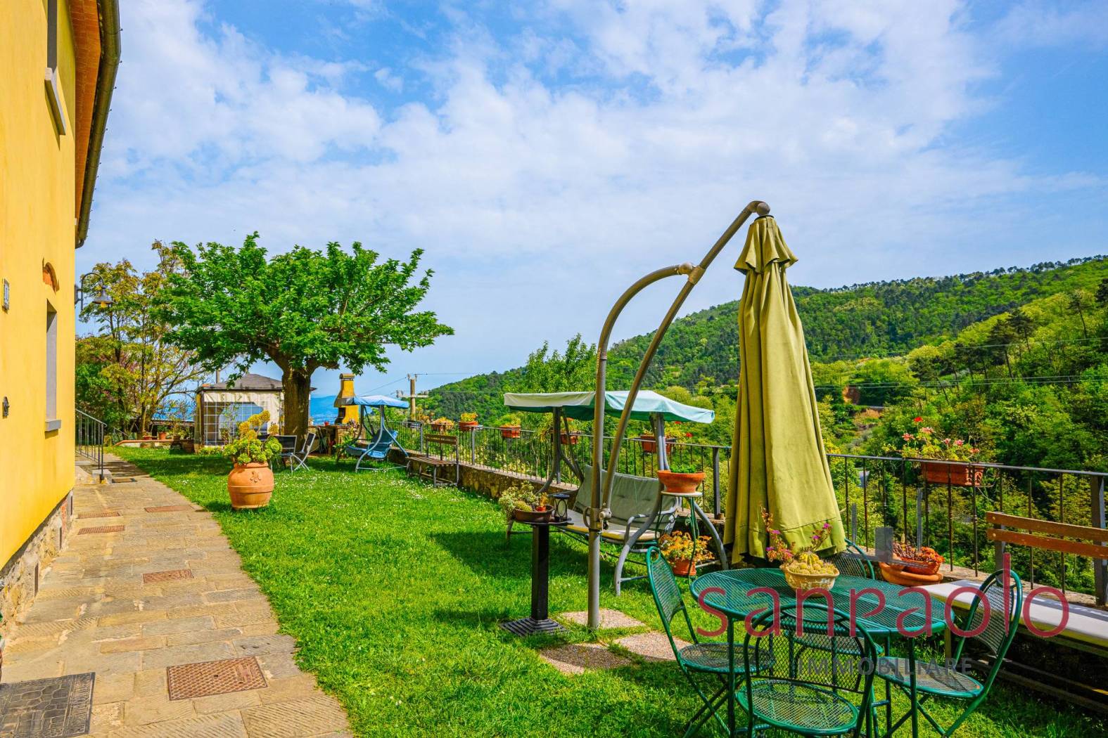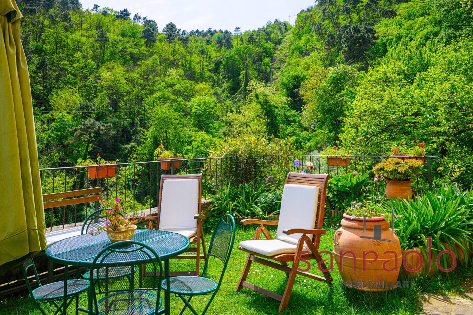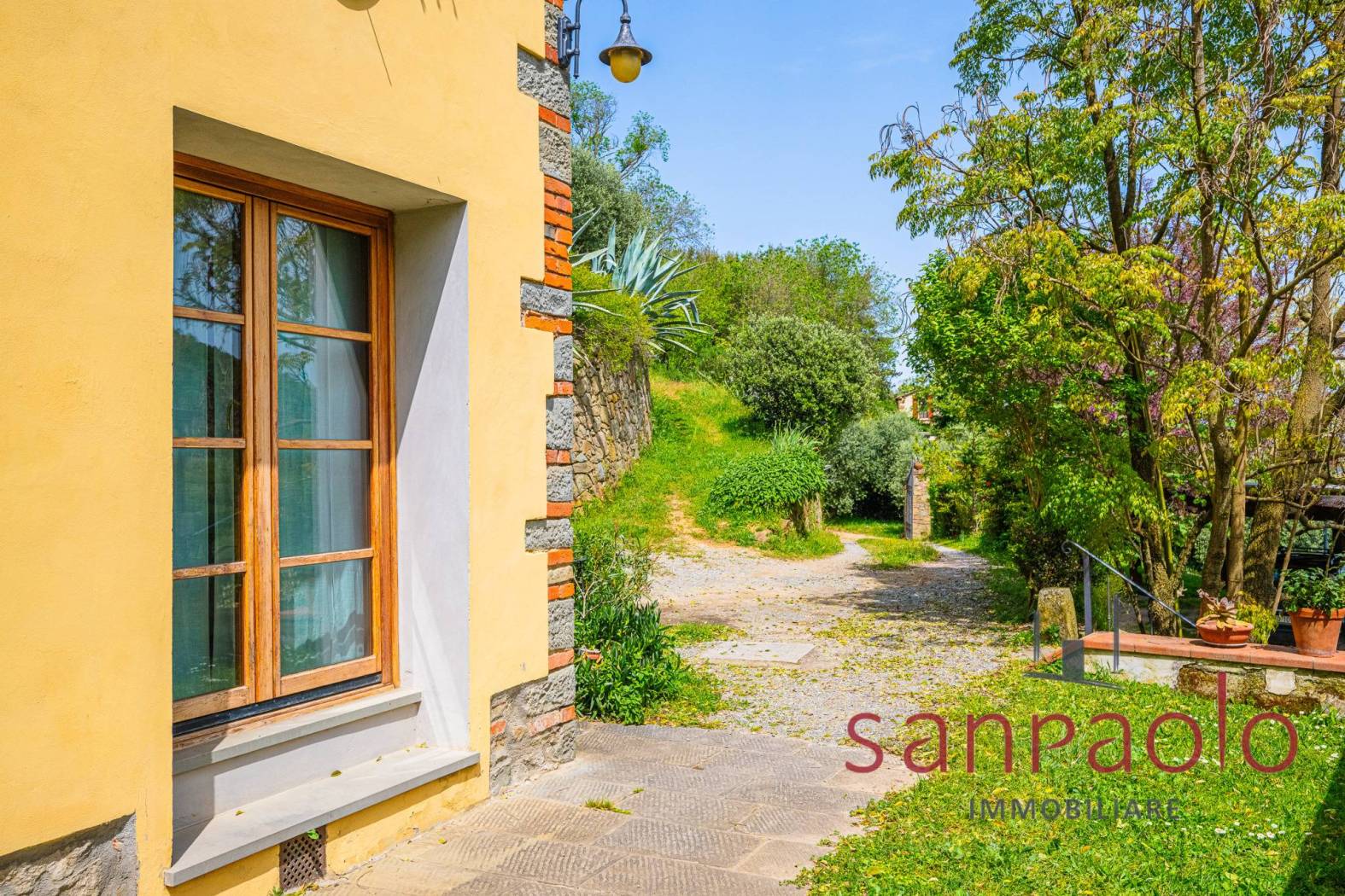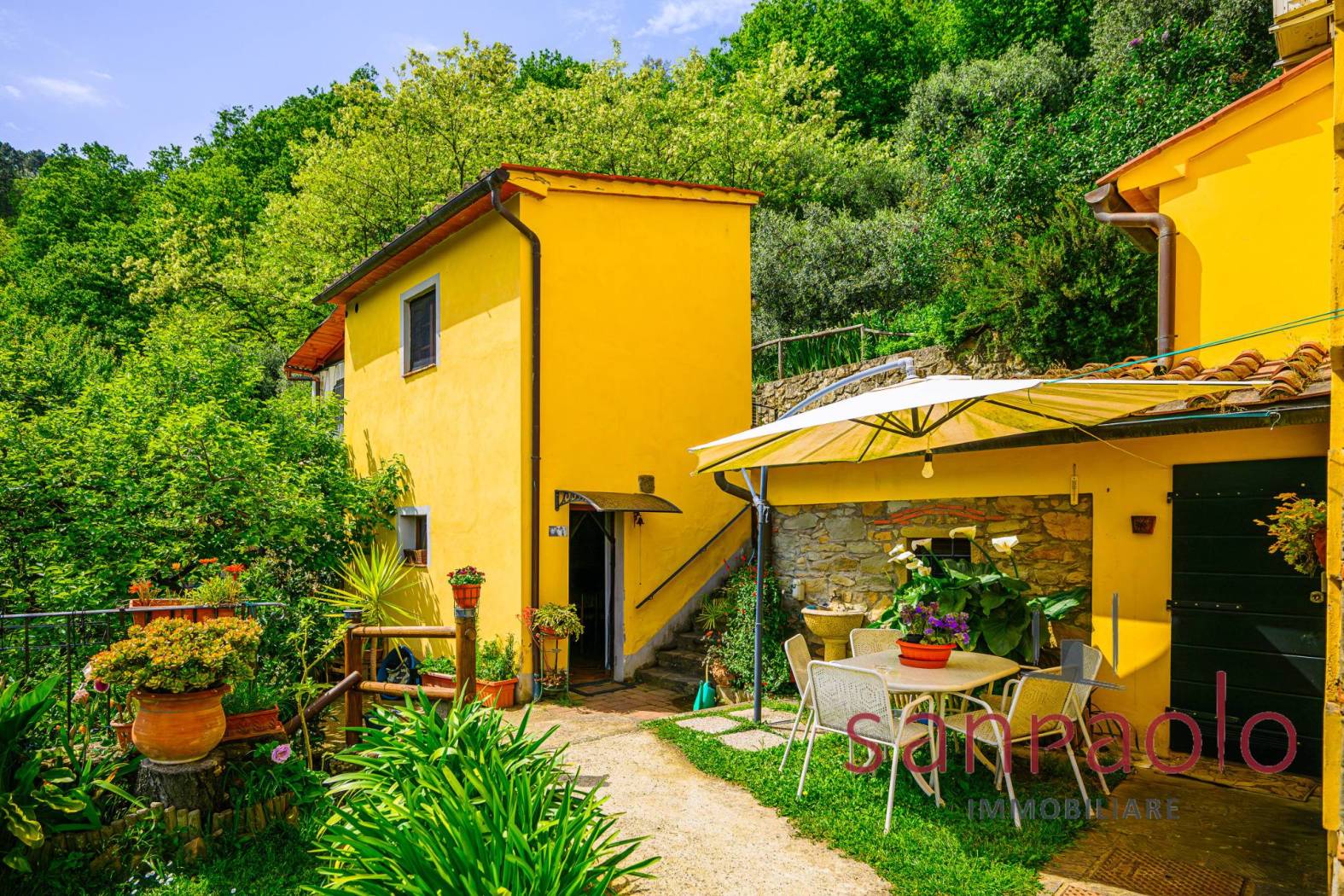 All'esterno, la proprietà si estende su circa 2,8 ettari di terreno, in parte a uliveto, frutteto e bosco. Gli ampi spazi verdi offrono un contesto ideale per vivere all'aria aperta in completa autonomia. L'approvvigionamento idrico è garantito da una sorgente privata.