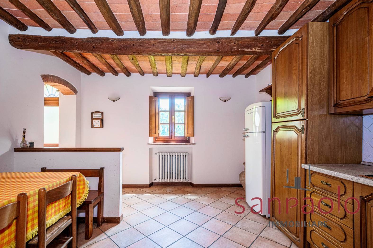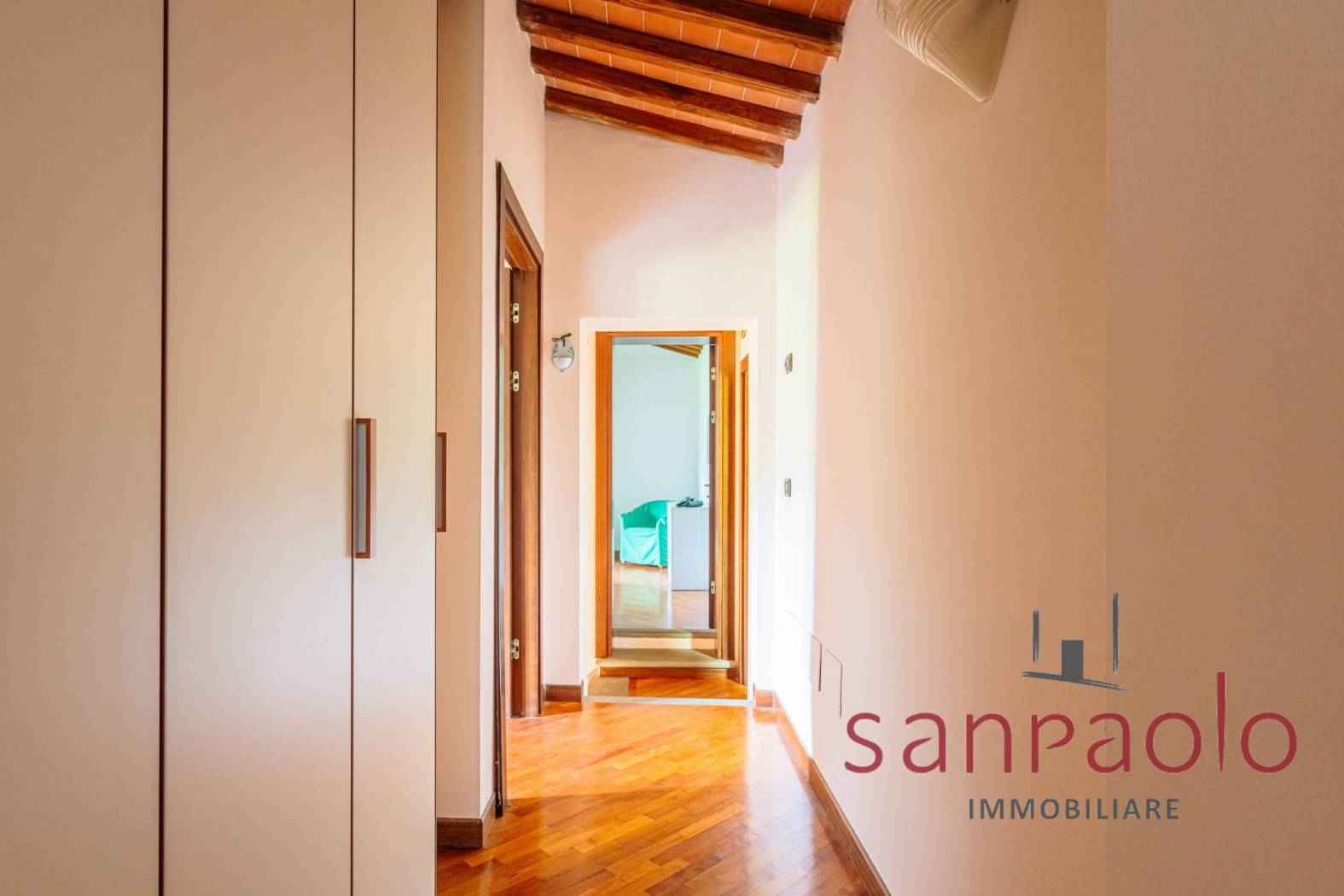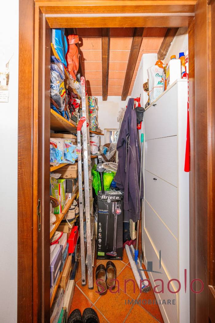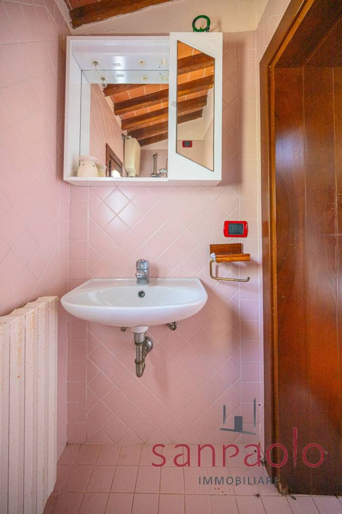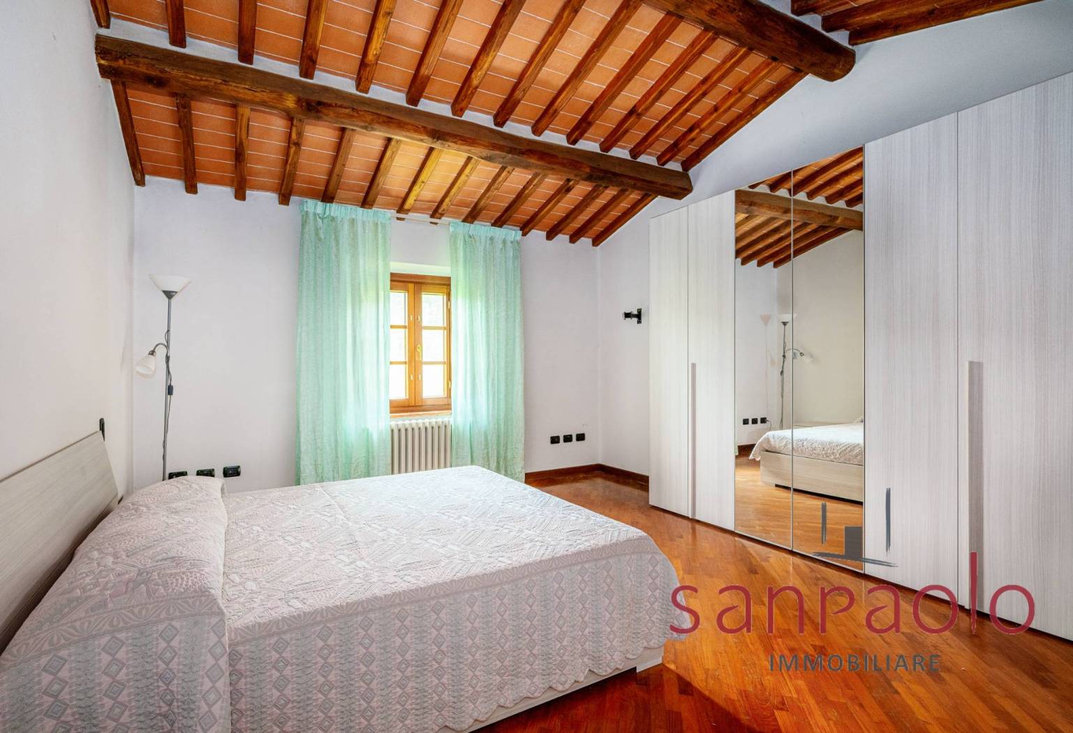 Entrambe le abitazioni sono caratterizzate da finiture tipiche toscane: travi a vista, pavimenti in parquet nella zona notte e dettagli in pietra serena.