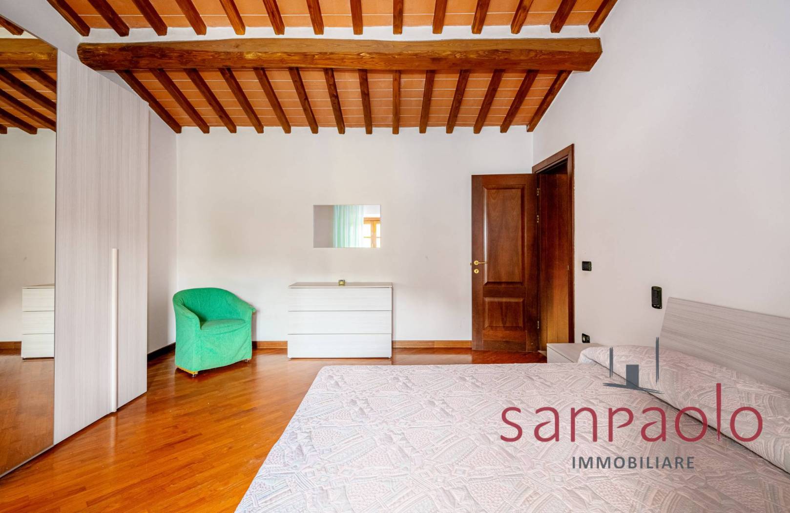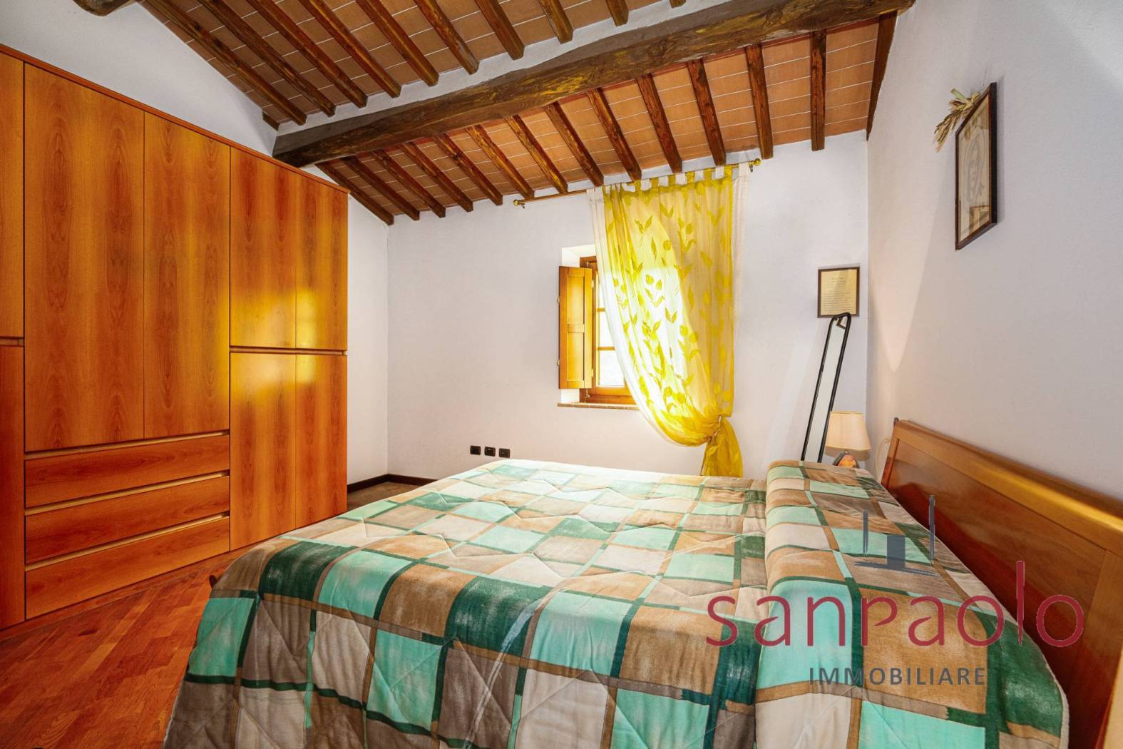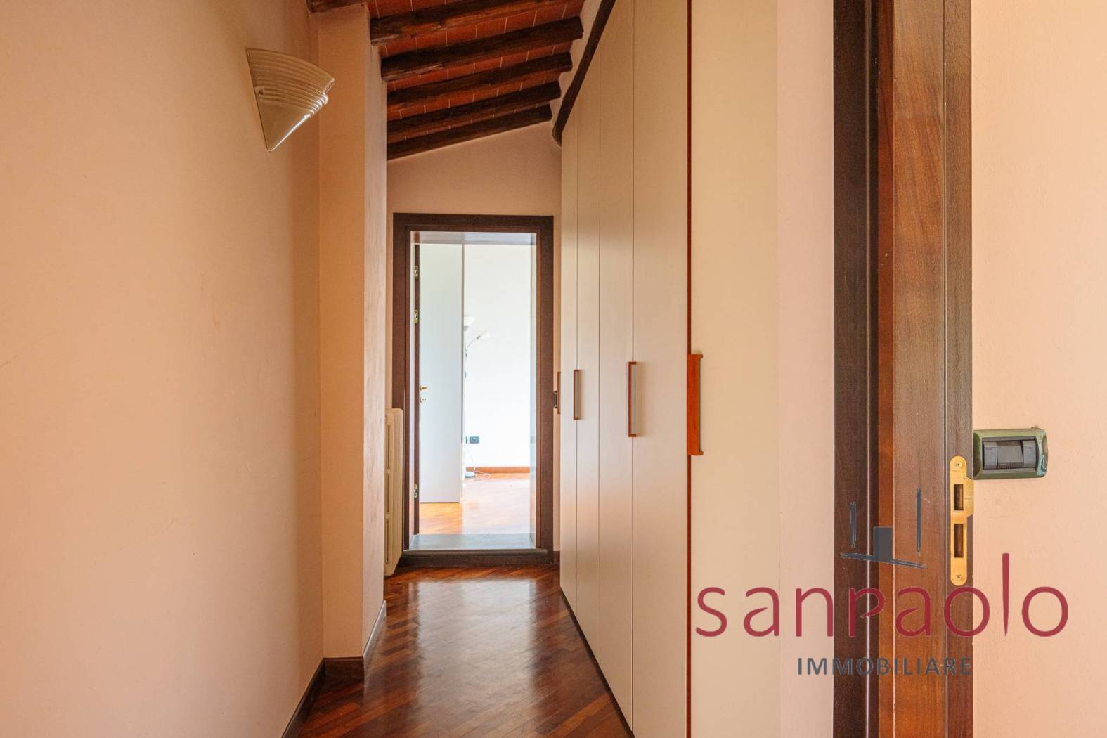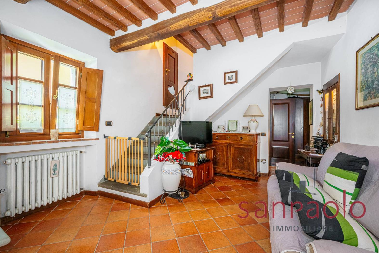 Entrambe le abitazioni sono caratterizzate da finiture tipiche toscane: travi a vista, pavimenti in parquet nella zona notte e dettagli in pietra serena.