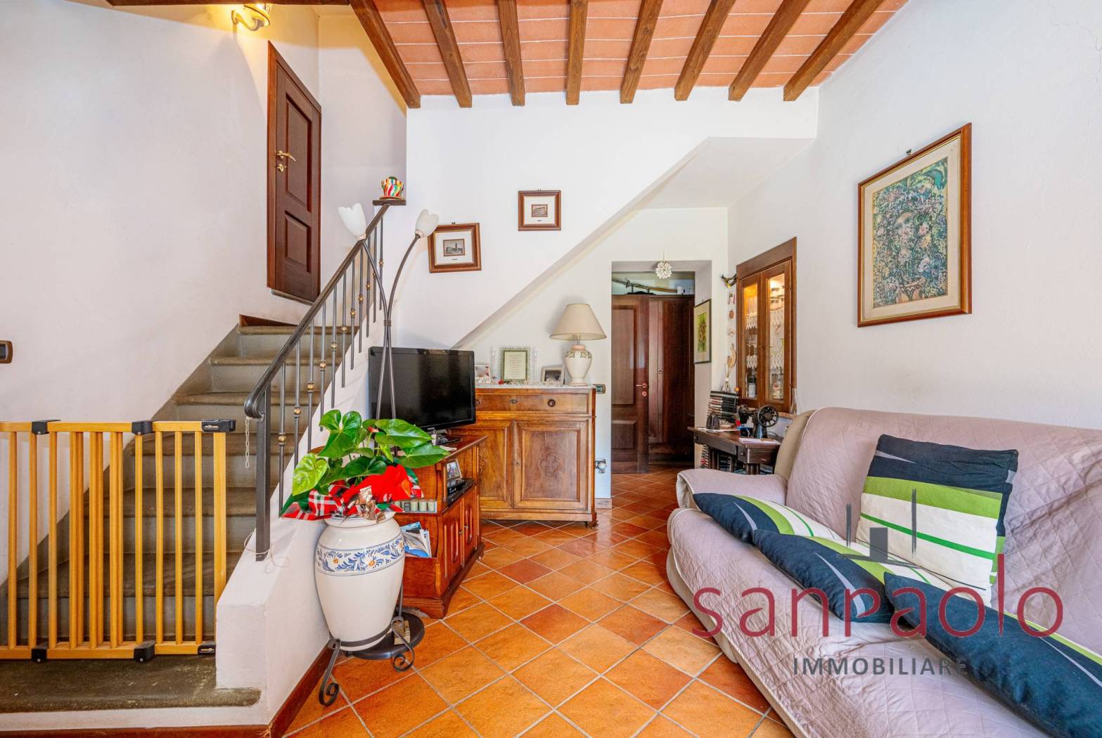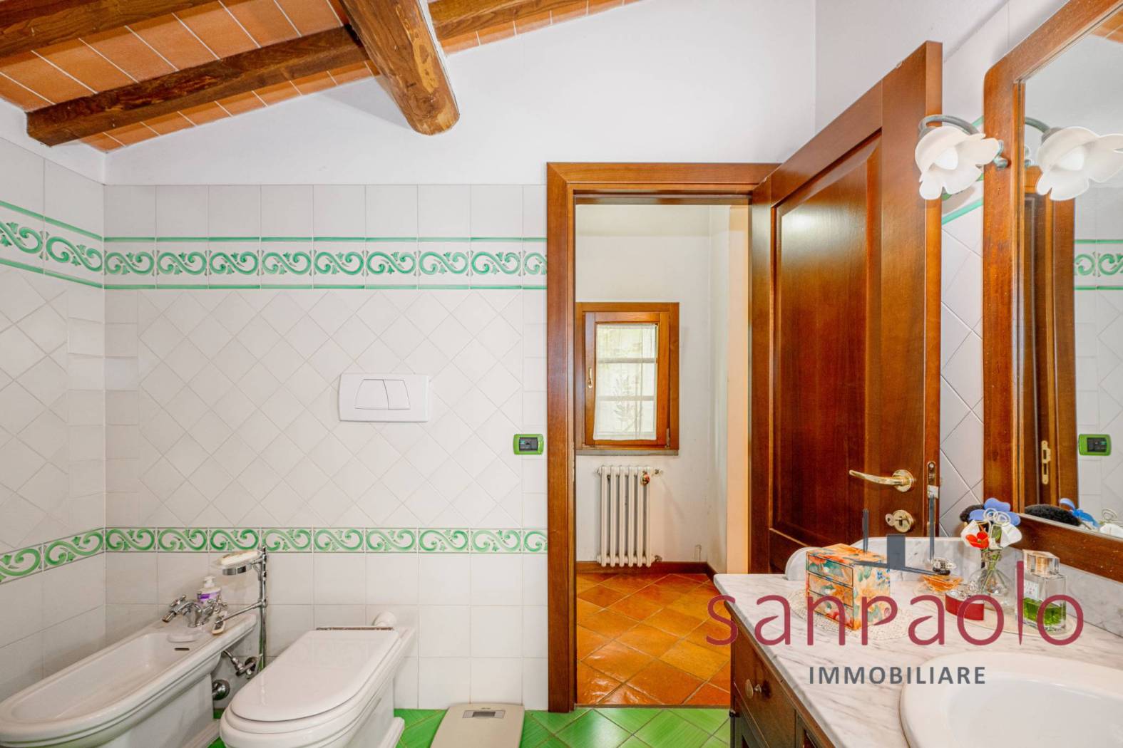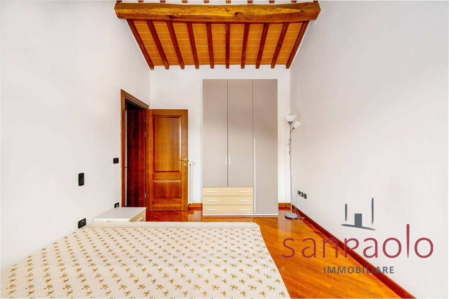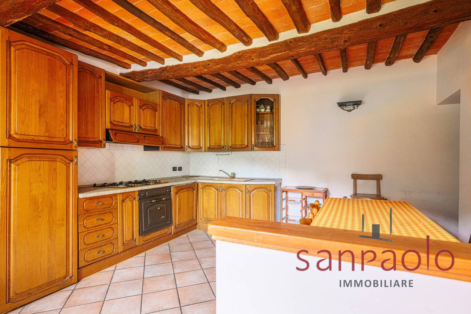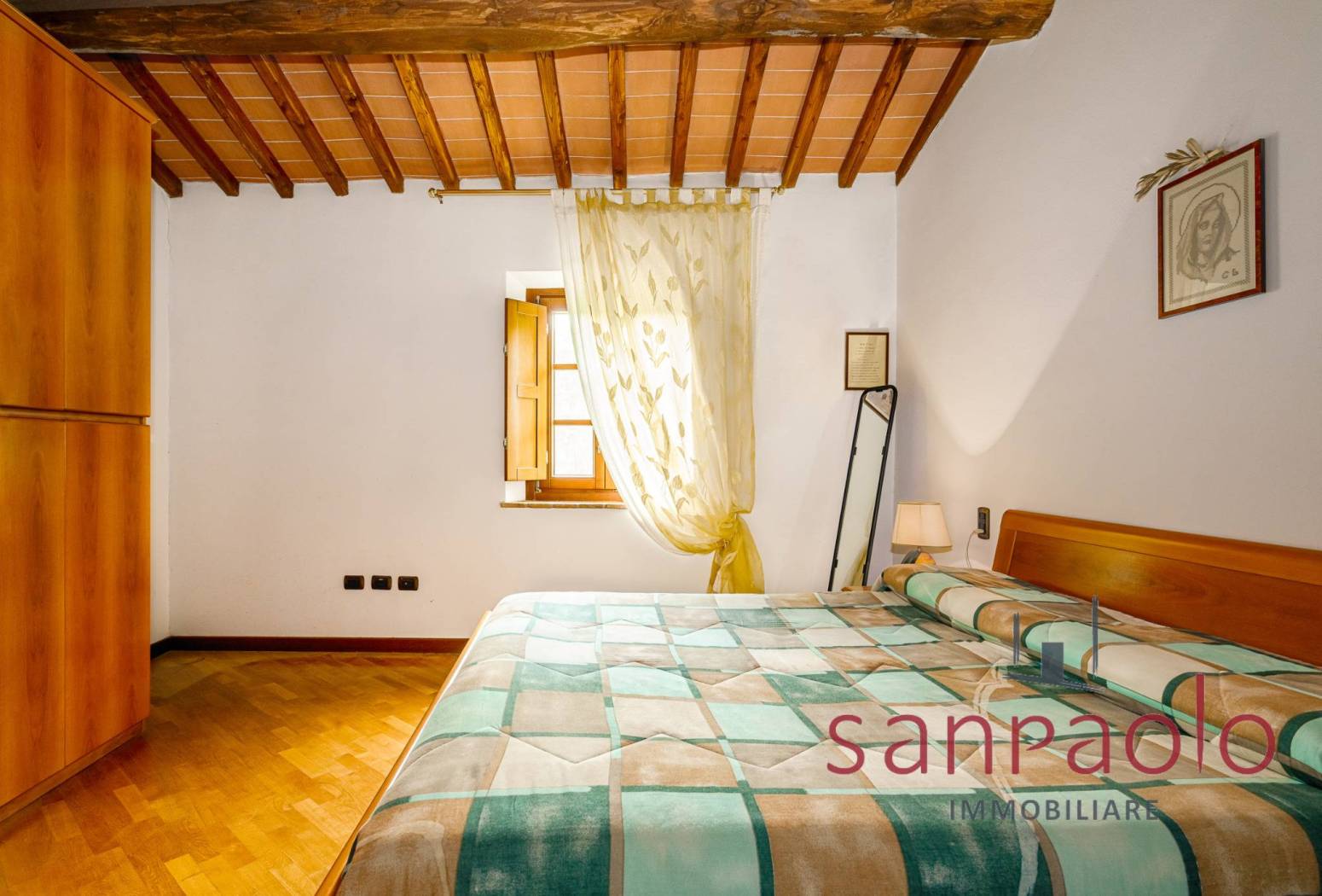 Entrambe le abitazioni sono caratterizzate da finiture tipiche toscane: travi a vista, pavimenti in parquet nella zona notte e dettagli in pietra serena.