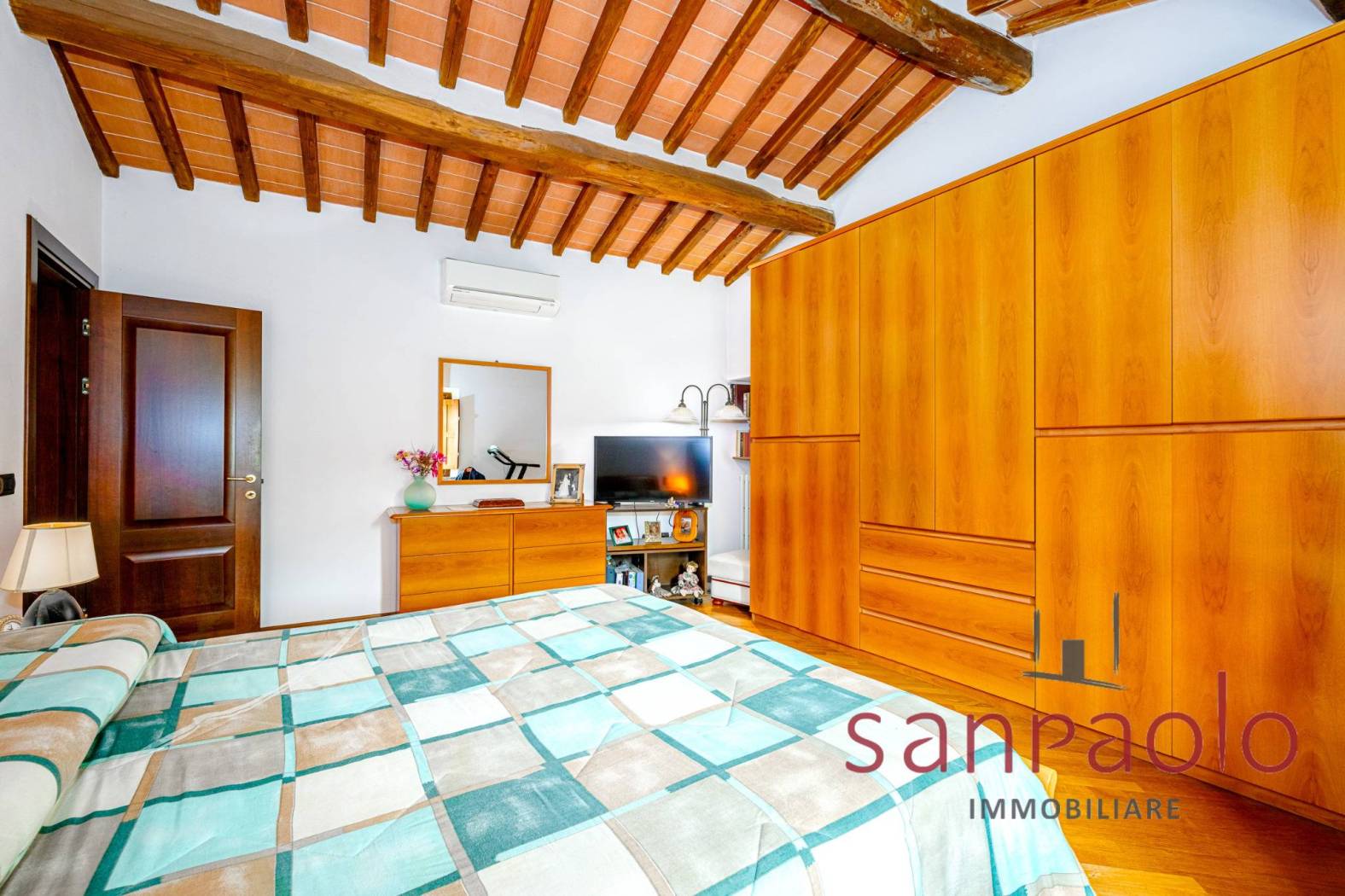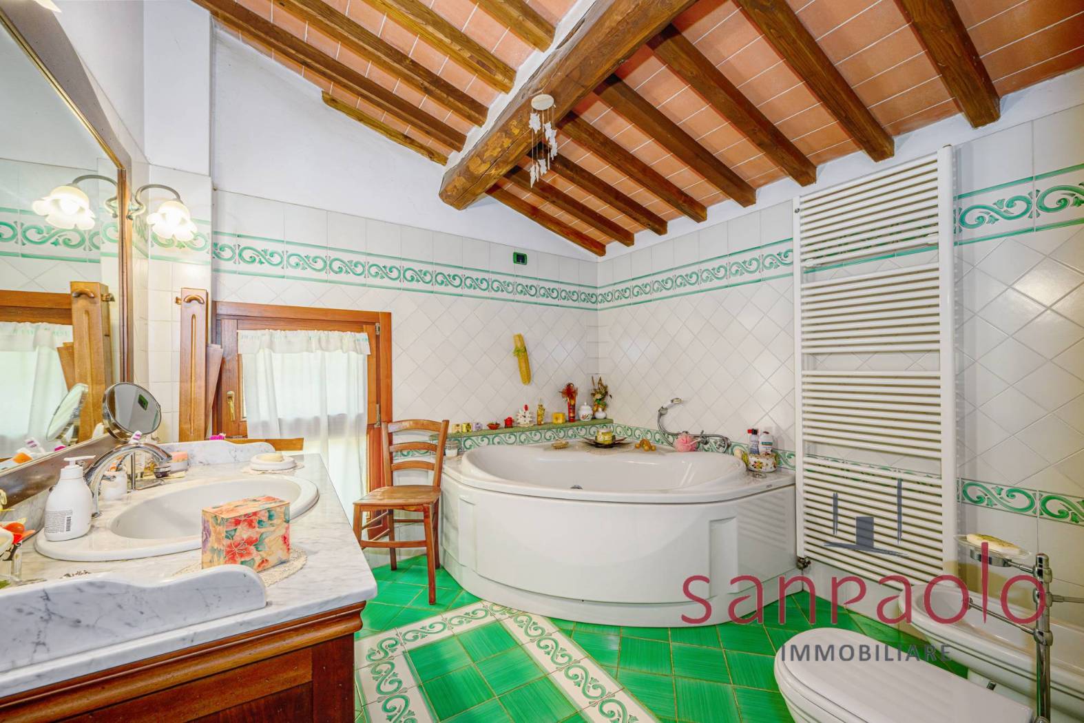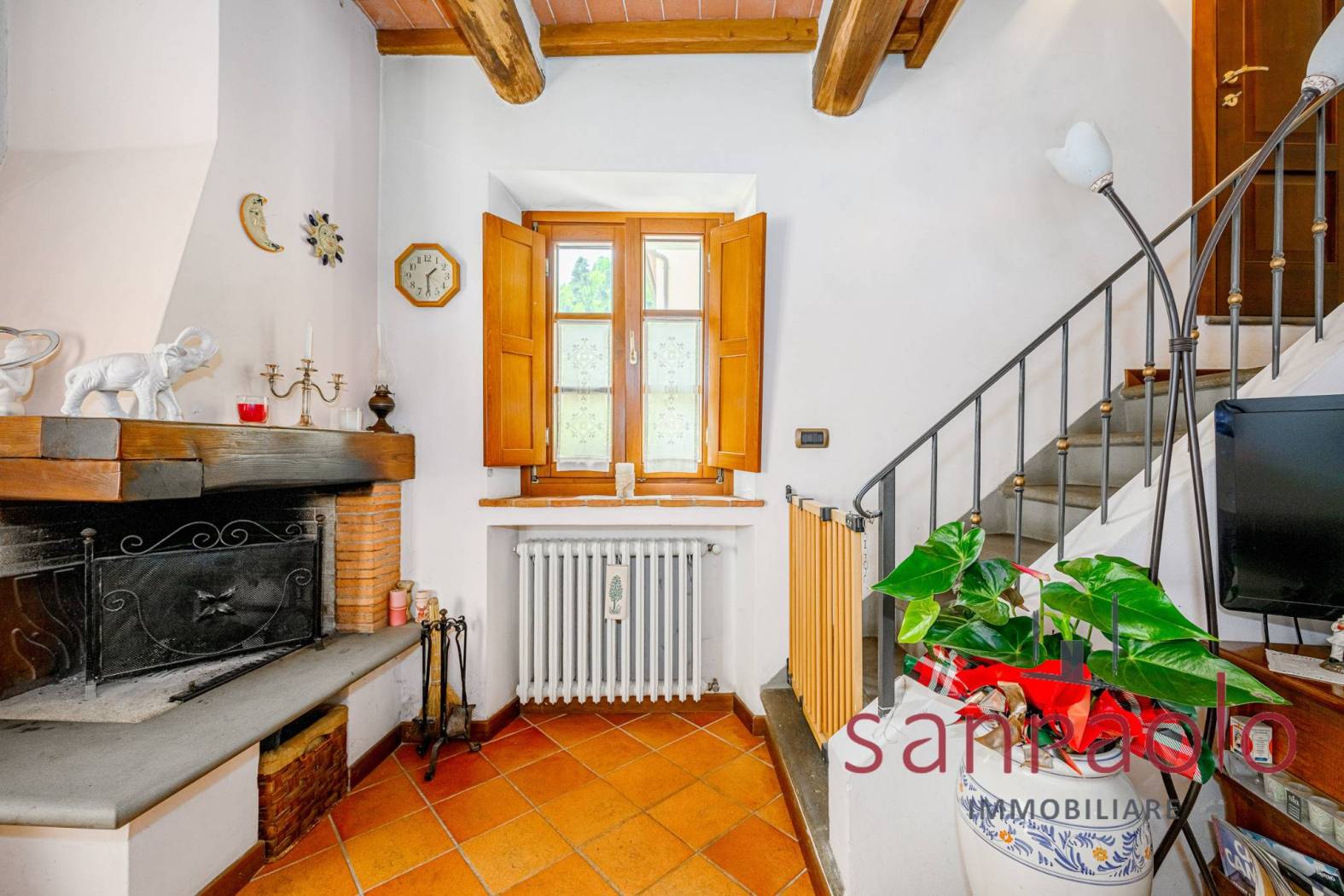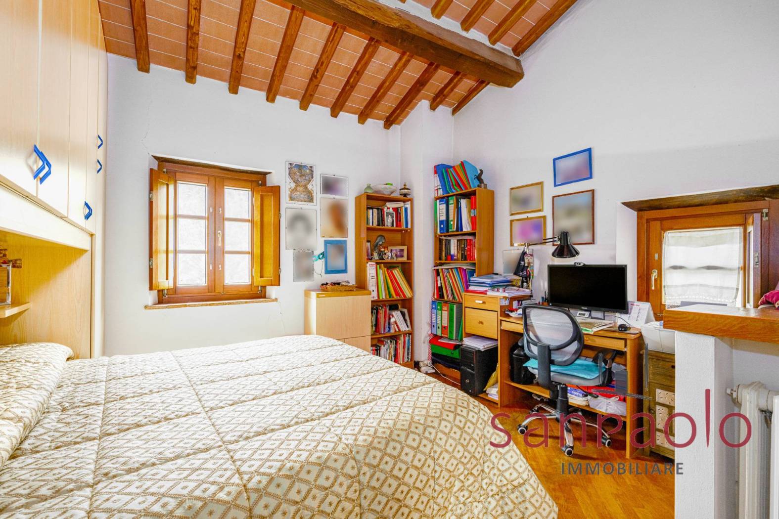 Entrambe le abitazioni sono caratterizzate da finiture tipiche toscane: travi a vista, pavimenti in parquet nella zona notte e dettagli in pietra serena.