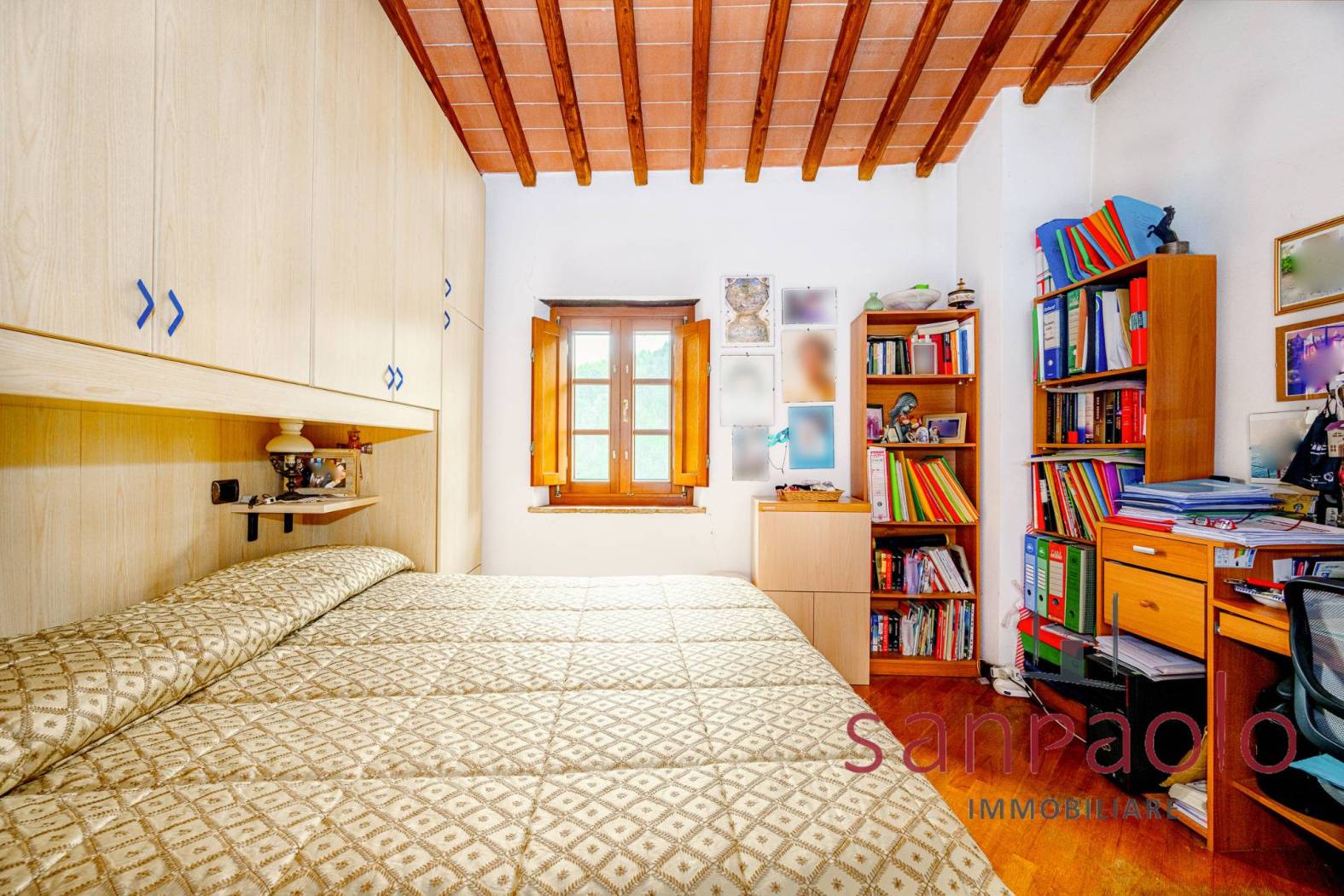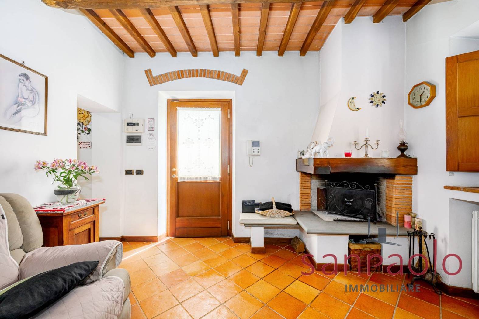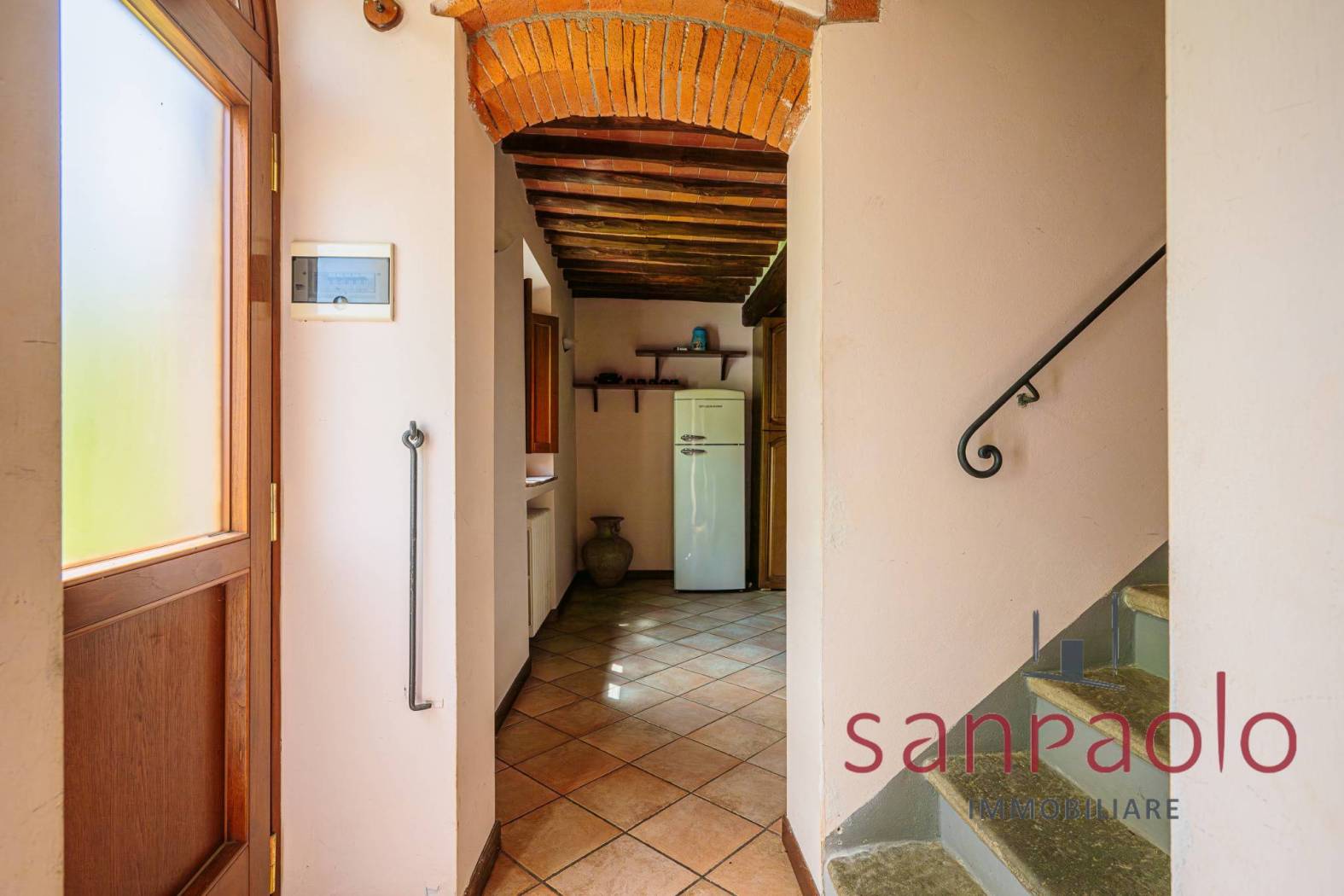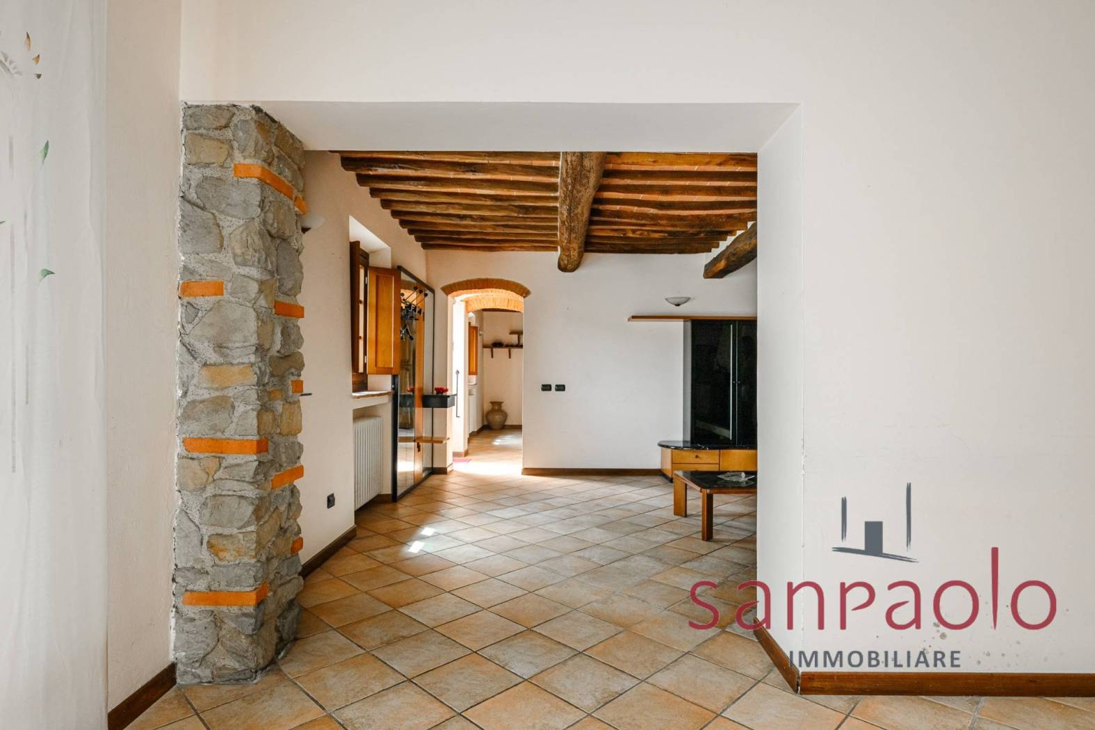 Entrambe le abitazioni sono caratterizzate da finiture tipiche toscane: travi a vista, pavimenti in parquet nella zona notte e dettagli in pietra serena.