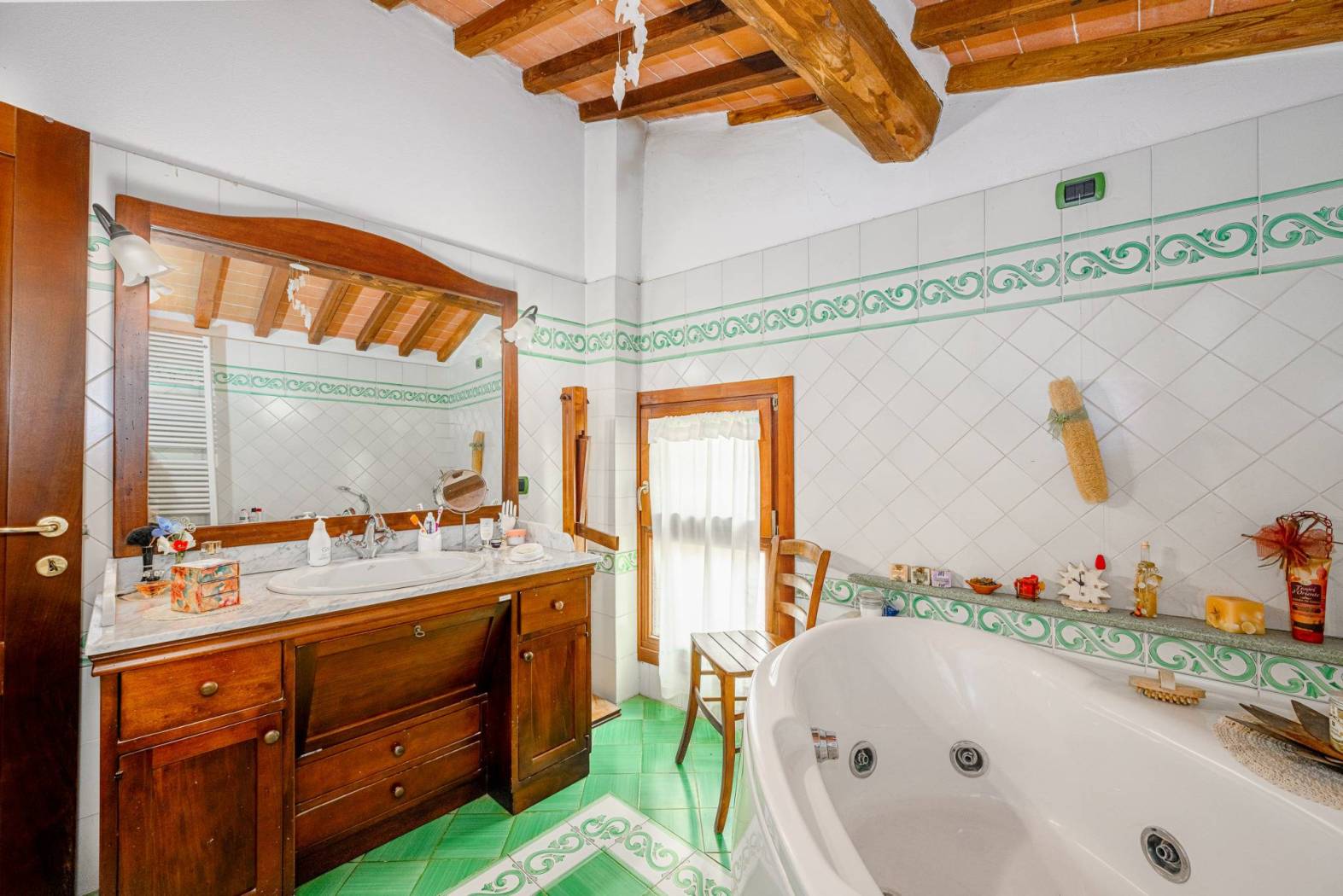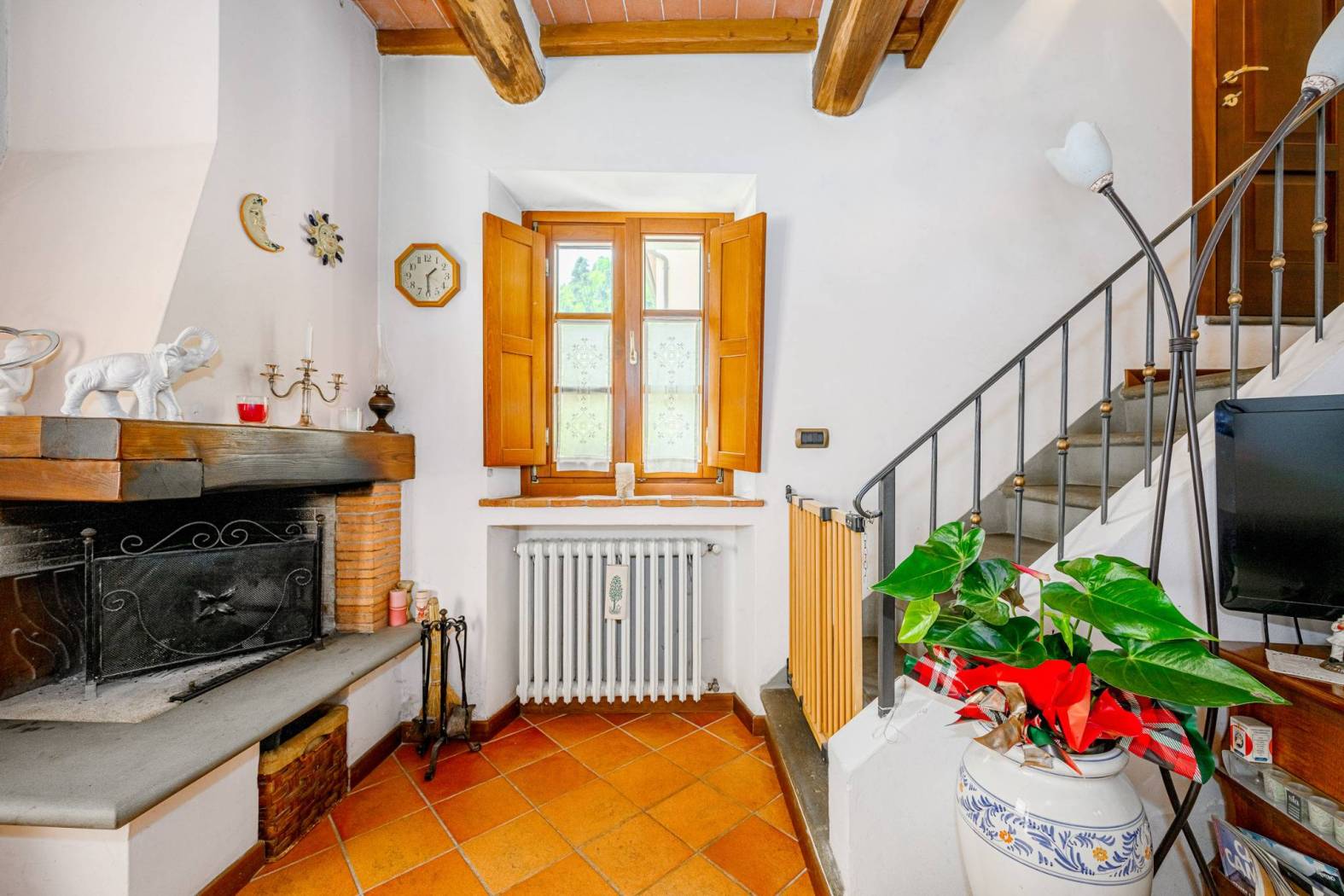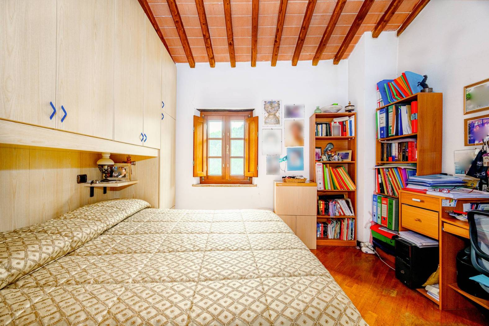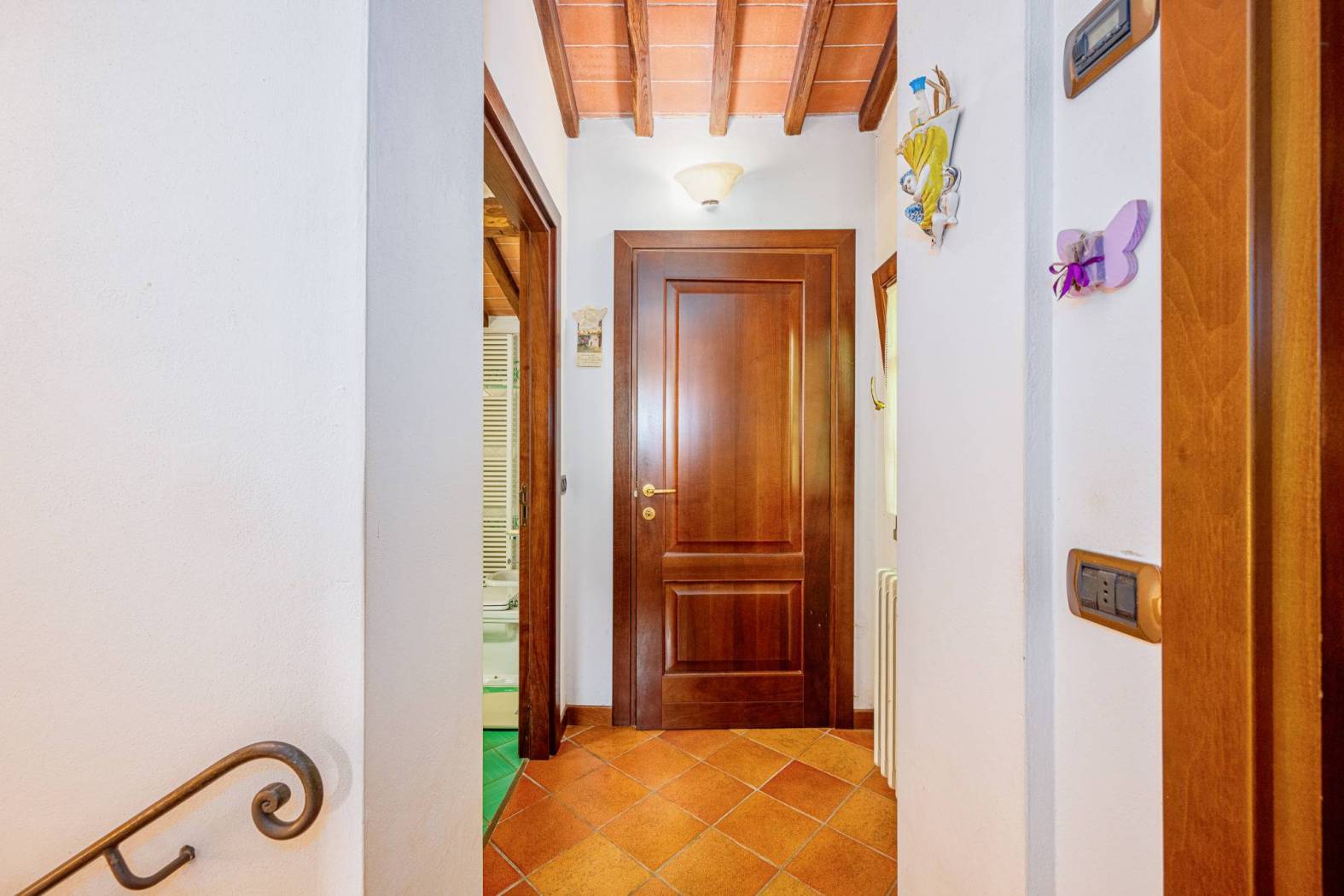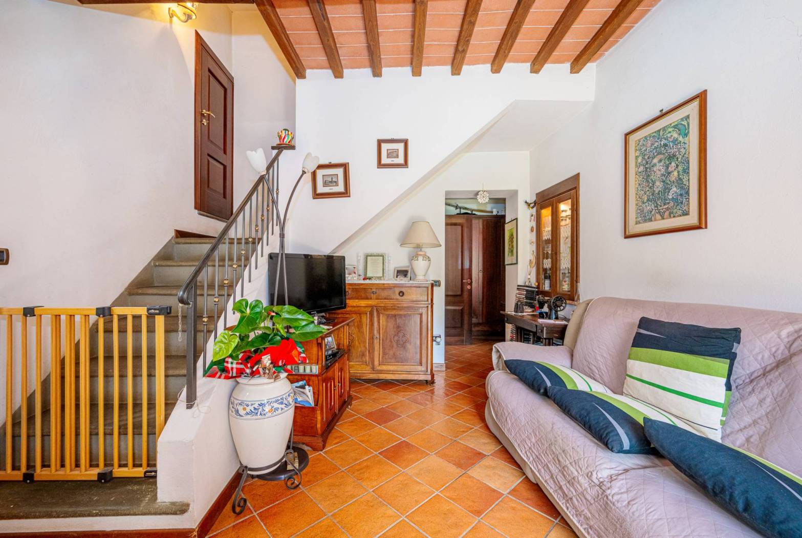 Immersed in the green hills of San Baronto, in a dominant and private position, we offer for exclusive sale a portion of a farmhouse free on three sides, perfect for those who wish to live in the quiet of the Tuscan countryside without sacrificing the convenience of services, reachable in just a few minutes. Located just 10 minutes from Casalguidi, the property enjoys an open and breathtaking view of the surrounding landscape, offering a scenery that changes with the seasons, always in the name of beauty and serenity. The residence: Spread over two levels for a generous and well-organized surface area, the house is composed as follows: - Ground floor: welcoming living room with fireplace, large rustic-style eat-in kitchen, bathroom, closet and laundry room with external access. - First floor: two double bedrooms, bathroom and closet. The finishes recall the Tuscan tradition, with exposed wooden beams, parquet floors in the sleeping area, and details in pietra serena that lend warmth and authenticity to the rooms. Rooms.